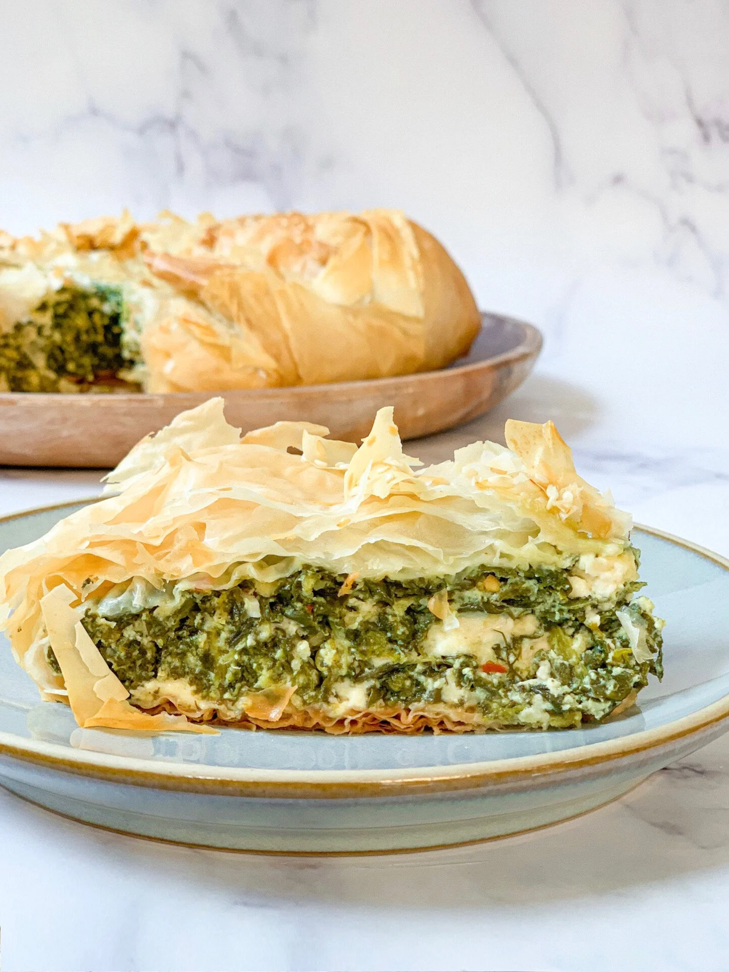 La Spanakopita es un plato griego típico hecho con espinacas, queso feta y hierbas envuelto en hojas de hojaldre.